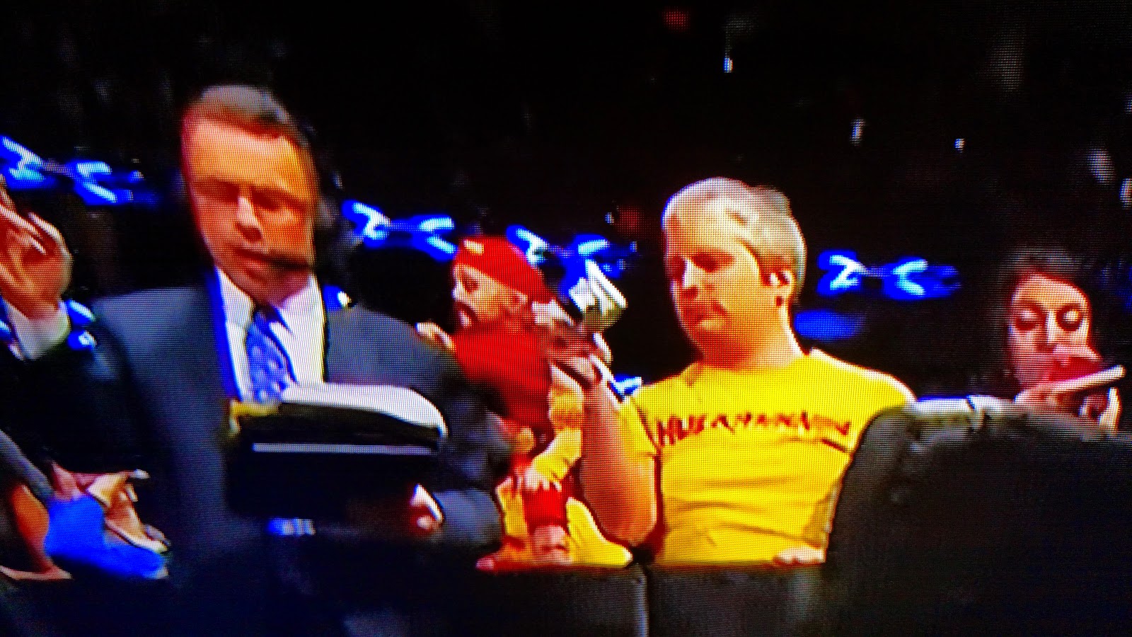 Our Twitter friend, Frankie Smith (@franksamillion, an awesome name) sent this picture. He paused his DVR on it without trying. It's a surreal picture that includes Randy Orton, Booker T, the Wrestlemania sign, and me. It is a great picture. I love it.